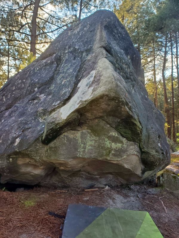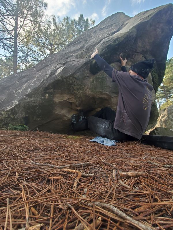 Sur le bloc de La Malapprise (n°30 orange). Partir assis à gauche avec une bonne prise MG, remonter l'arête et sortir à droite comme pour La Malapprise (n°30 orange). NB : première réalisation connue par Laurent D