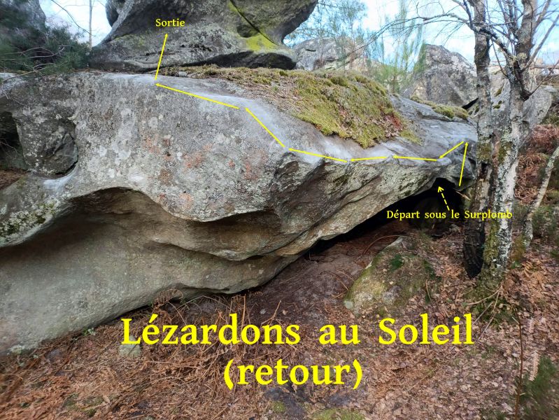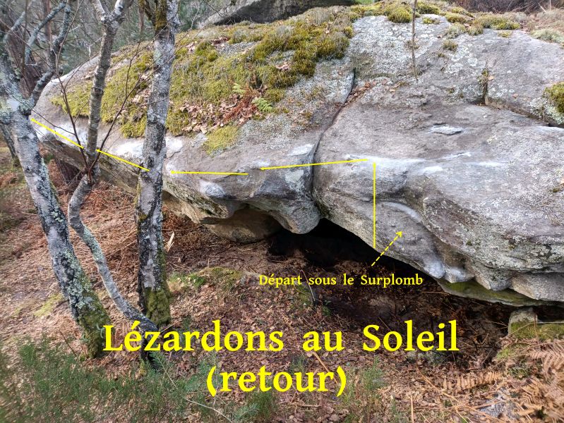 Sur la face Sud-Ouest du bloc à droite de The Enterprise. Partir au fond du toit avec les deux mains sur une grosse pince horizontale, rejoindre le rebord, traverser à gauche, passer l'angle et sortir en réta.