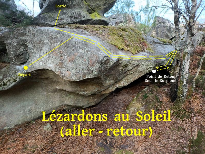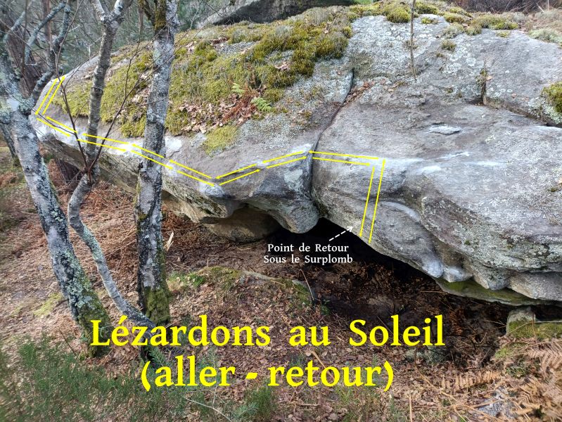 Sur la face Sud-Ouest du bloc à droite de The Enterprise. Partir assis avec un plat MD, traverser à droite, passer l'angle, redescendre au départ du Surplomb du Lézard et repartir dans Lézardons au Soleil (retour).