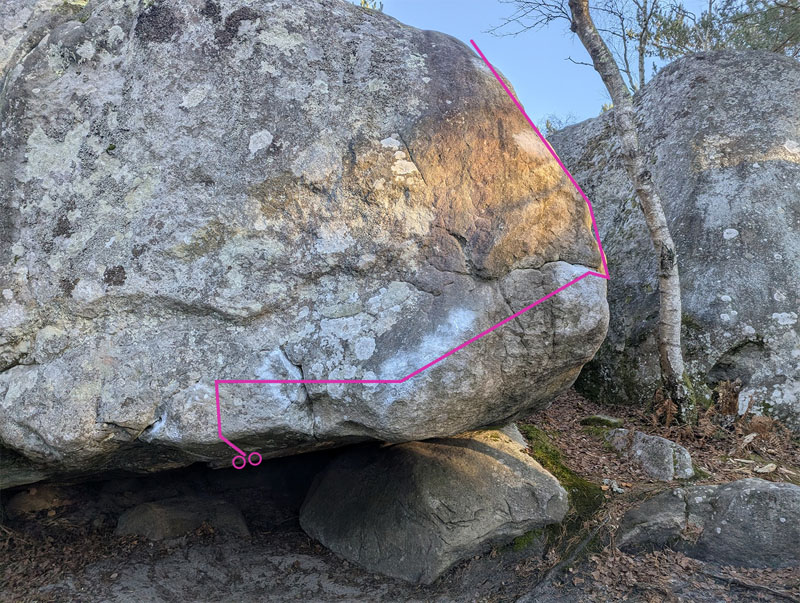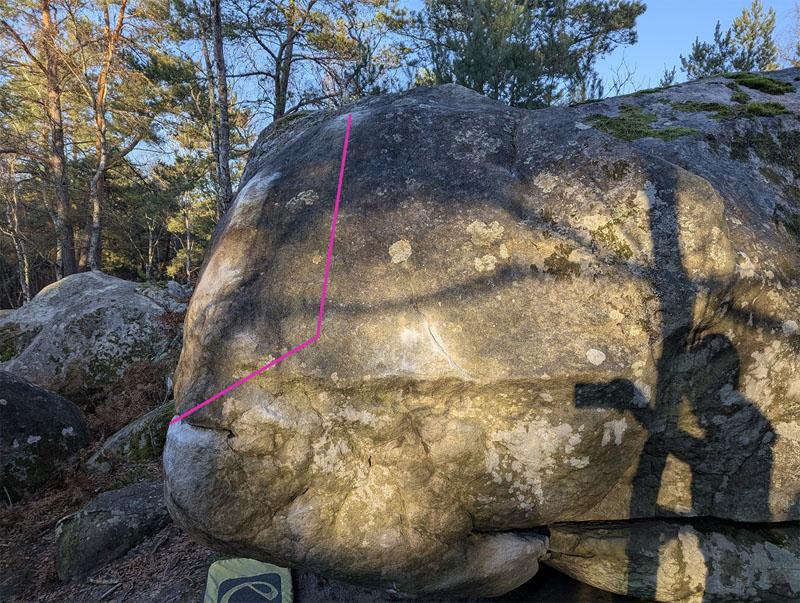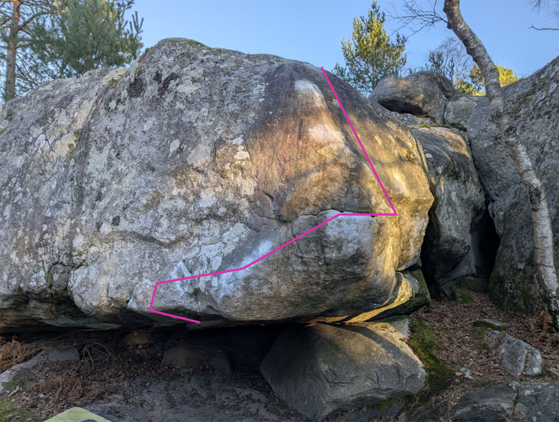 Partir assis au fond du toit avec l'écaille de Malfrat, remonter le dévers dans la face de La Murène (n°38 bis rouge), traverser à droite sur le rebord et sortir dans Malfrat.
