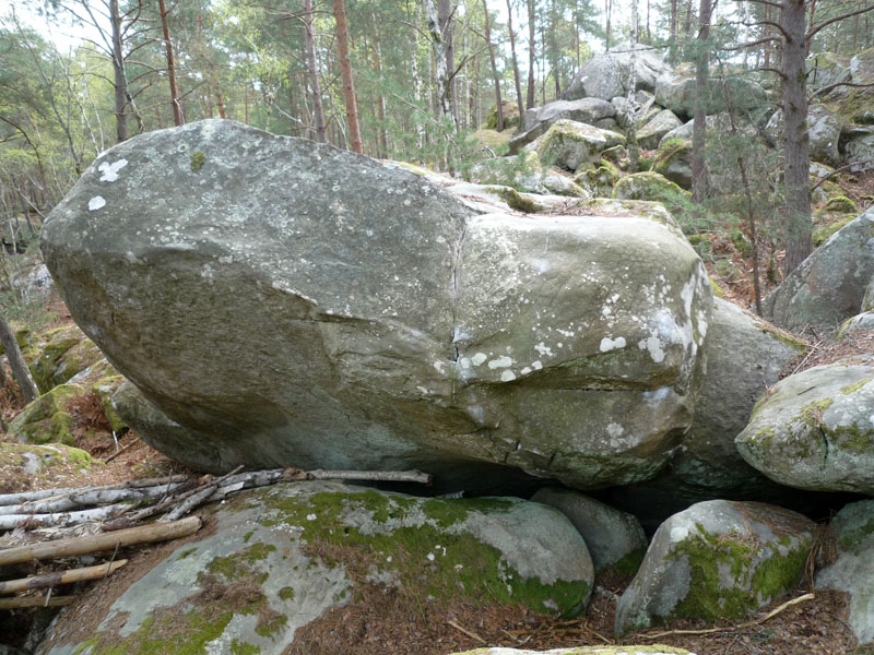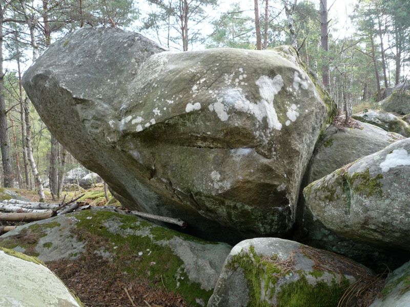 Sur un gros bloc de Scutelle, 20m en contrebas de Gaston fait Gaffe (n°18 bis bleu) et de Torchon Chiffon Carpette. Partir assis dans la fosse 5m à droite de Scutelle et sortir à gauche.