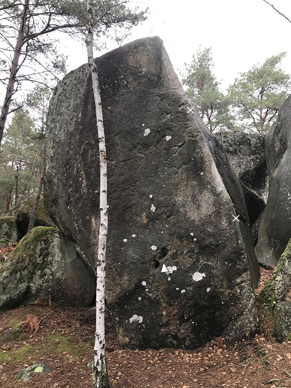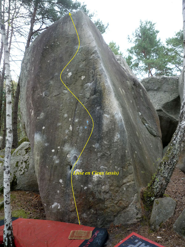 Dalle directe juste à gauche de L'Essentiel (n°16 bleu), sans utiliser l'arête, sur le bloc du "Pavé gauche", le long de la croupe menant au sommet du pignon. Partis assis avec deux gros trous évidents et sortir dans Lisse en Cieux.