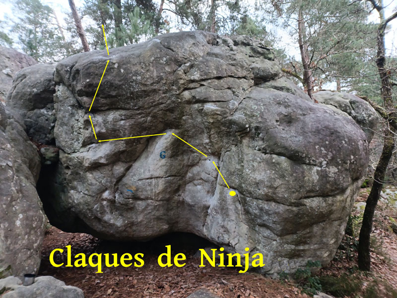 Sur la face avec la lettrine "G". Partir assis sans crash-pad comme pour Paire de Claques (assis), traverser à gauche et sortir dans Ninja (n°25 enchaînement virtuel non fléché).