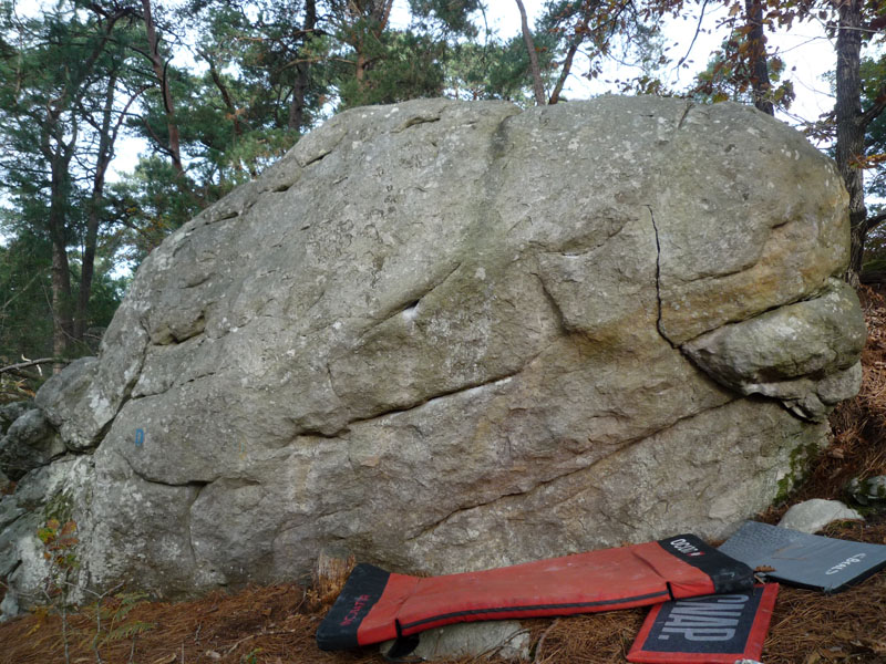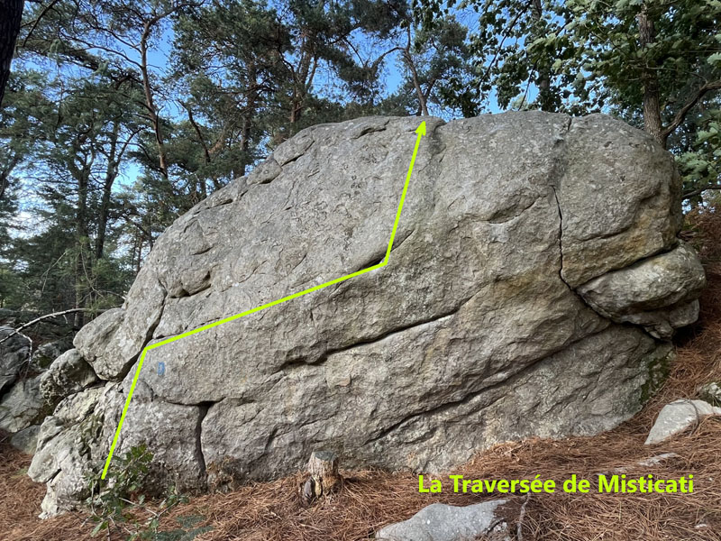 Sur le bloc avec la lettrine "D". Partir assis à gauche au niveau de La D-Route (n°24 enchaînement virtuel non fléché), traverser à droite dans le mur et sortir dans Misticati (n°11 enchaînement virtuel non fléché).