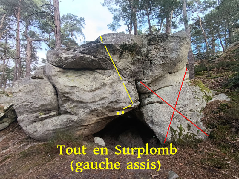 Partir assis avec une bonne prise et remonter le surplomb sans utiliser la partie à droite de la fissure comme pour Tout en Surplomb (assis) (n°8 ter enchaînement virtuel non fléché) et sortir sur la gauche en réta.