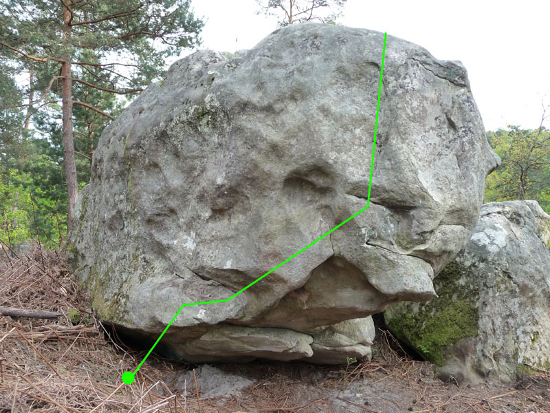 Sur le bloc du "Bowling", 30m à l'Est de L'Apesanteur et la Grâce (assis) (n°20 enchaînement virtuel non fléché). Partir assis tout à gauche, remonter le dévers en traversée ascendante vers la droite et sortir le long de la proue légèrement vers la droite comme pour Spare à Bras.