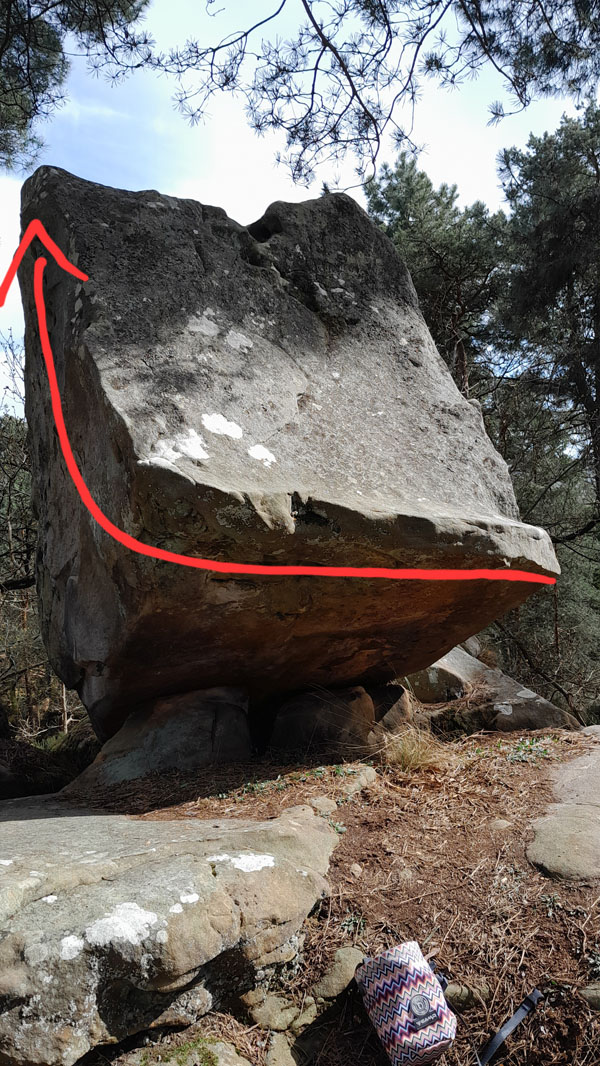 5m au Sud de La Casquette, complètement à l'Ouest du massif, sur la crête qui remonte depuis le Carrefour de ND de Bon Secours. Partir assis à droite avec un crochet de talon à droite de l'angle, traverser à gauche au ras du sol, basculer sur la face de gauche et se rétablir au sommet.