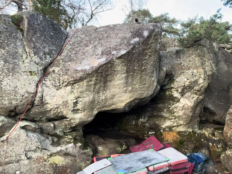 30m au-dessus de l’auberge. Partir sur le socle à gauche, traverser à droite et sortir avec l'arête de droite.