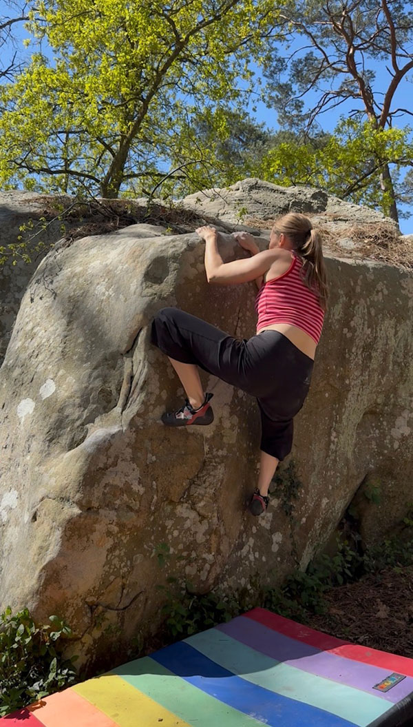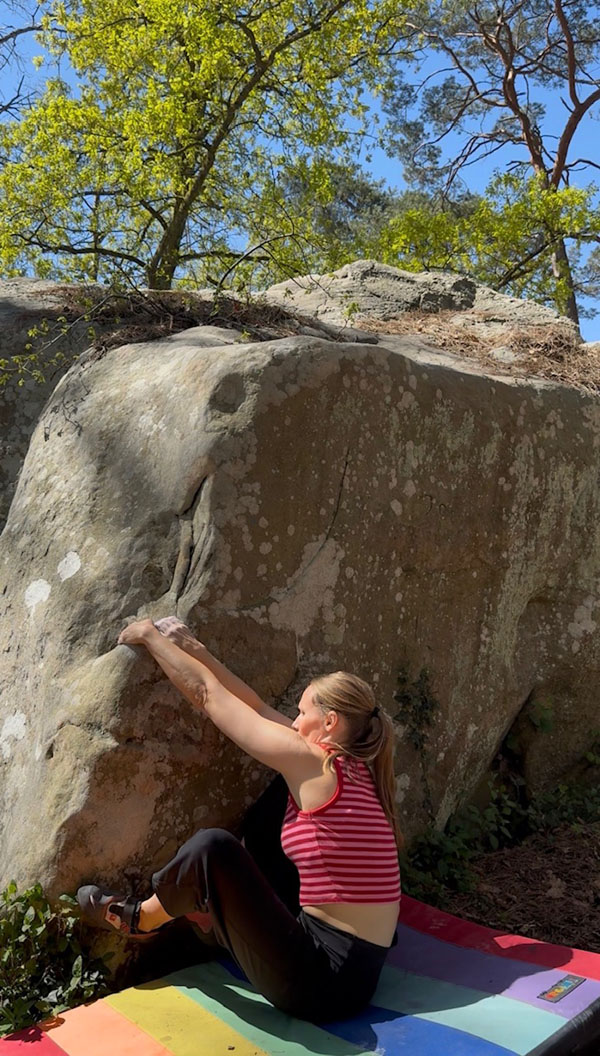 Sur l'envers du bloc de La Sancho (direct) (n°29 bleu). Partir assis avec une bonne prise, remonter le mur légèrement vers la droite et sortir en réta au dessus.