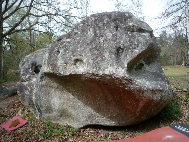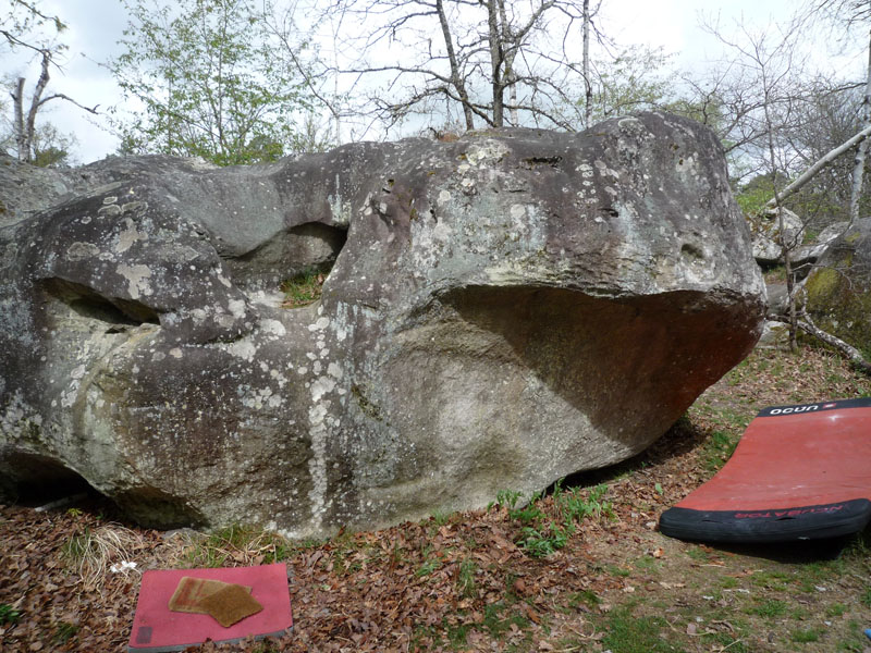 Sur le bloc en face de Travbas (n°9 bleu), au Nord-Est du secteur. Partir assis au niveau du gros trou en forme de cuvette comme pour La Souris Verte, traverser à droite à l'aide de trous et sortir en réta dans une vague conque.