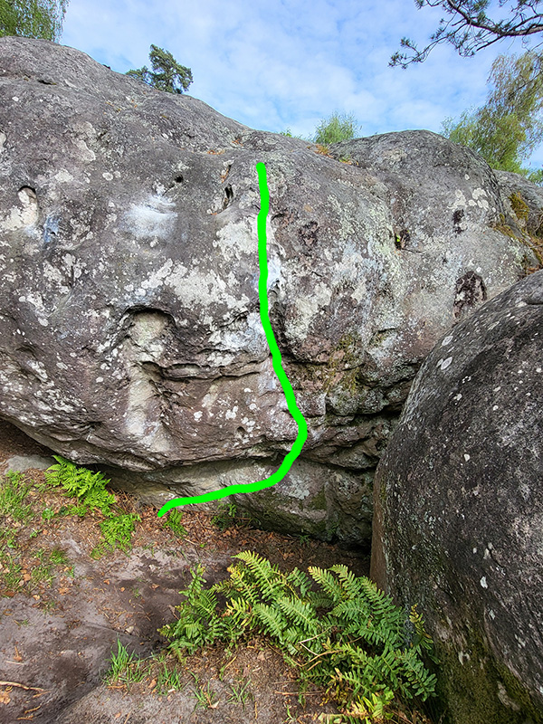 Sur le bloc à droite du toit de Lévitation (n°10 blanc). Partir assis dans la face de droite avec les pieds dans le trou à gauche, une bonne inversée MG et une pincette MD et sortir directement.