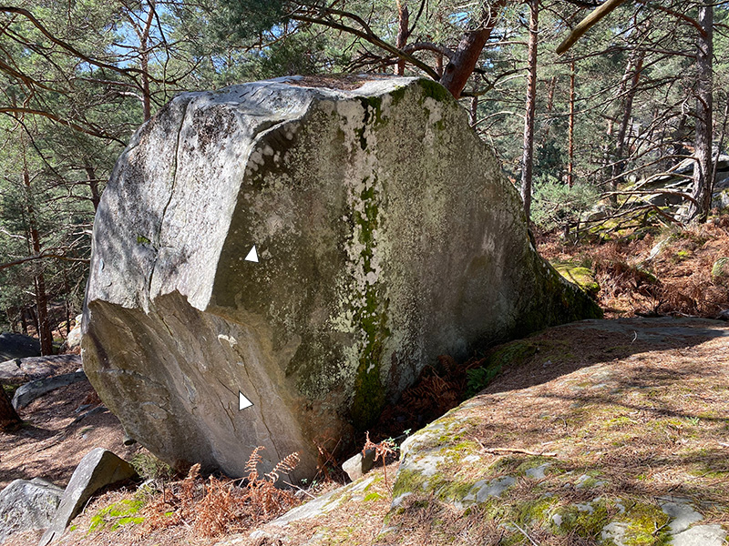 Arête de droite sur le bloc n°53 du parcours orange montagne, à l'Est du Petit Cervin, au dessus de la Route Amédée. Partir assis avec l'arête MD à droite de Nautile et sortir à droite avec l'arête MG.