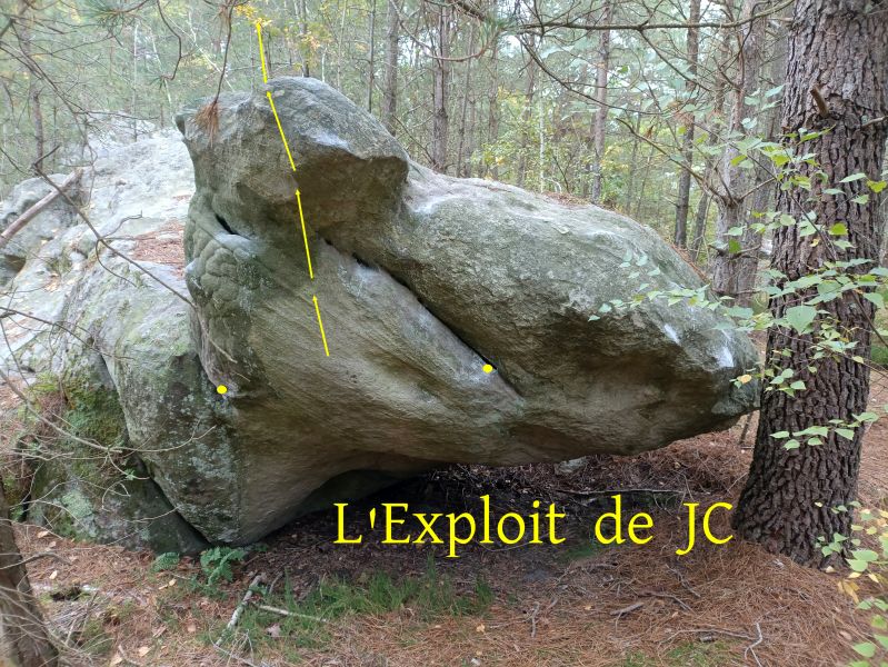On a small boulder, 5m South of La Roche du Requin. Sitstart without crash-pad, left hand on a sidepull and right hand on a good sloper and exit above. NB: first known ascent by Patpat, Davidesens and Jérôme Collet.
