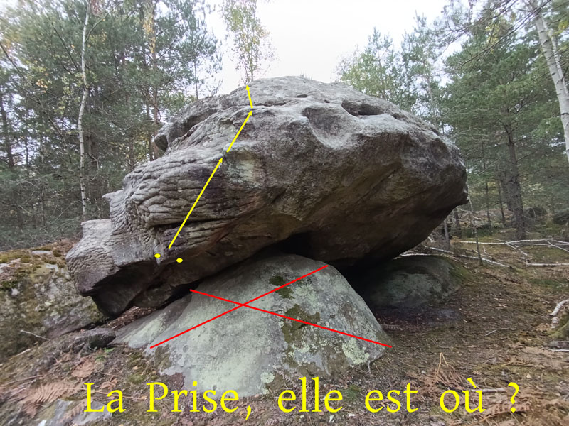 Voie de gauche sur le bloc de RétAmer, 40m à l'Ouest de La Roche qui Tremble. Partir assis sans crash-pad avec une bonne inversée, remonter le dévers sans utiliser le socle et sortir légèrement à droite.