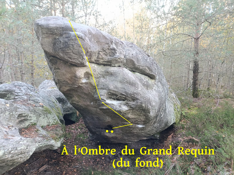 25m à l'Ouest du bloc de "La Roche qui Tremble" et du Requin Bleu. Partir presque allongé au fond, avec les deux mains dans un gros trou rond, remonter le dévers et sortir au dessus comme pour À l’Ombre du Grand Requin (assis).