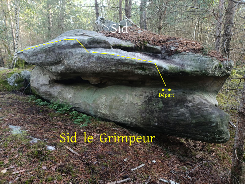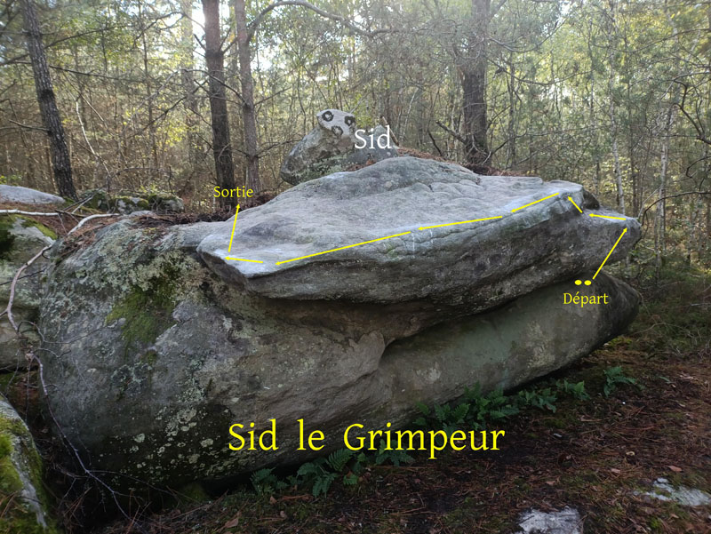 25m au Sud du bloc de "La Roche qui Tremble" et du Requin Bleu. Partir assis avec les deux mains dans la bonne prise du bas, traverser à gauche jusqu’au bout et se rétablir au dessus.