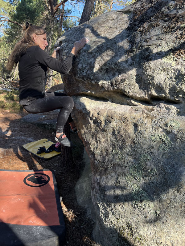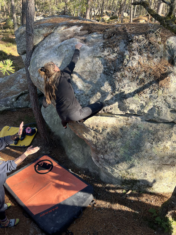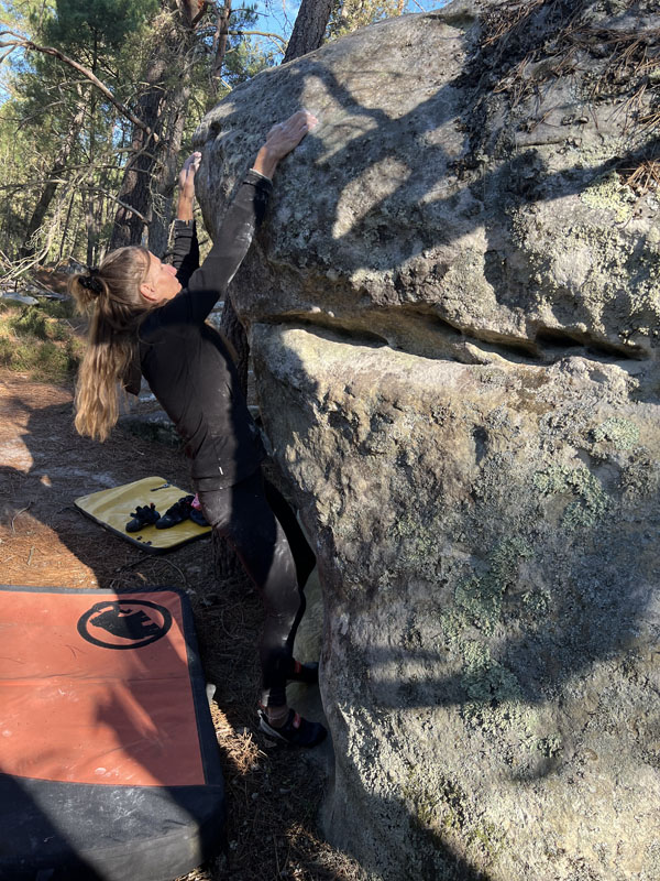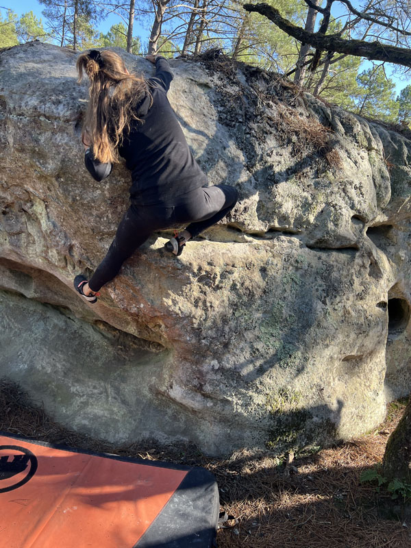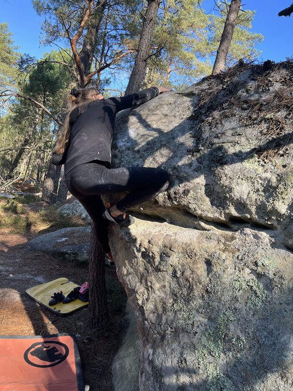 Sur le bloc à gauche de Catatonie, dans le couloir du sentier des 25 Bosses, juste derrière Canicula. Partir assis avec des inversées et sortir en réta sur des plats.