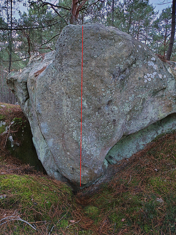 En face de 93 Bougies pour le Paternel, 15m à droite de Chicorée. Partir assis du sol en compression avec l'arête ronde MG et un trou bas MD.