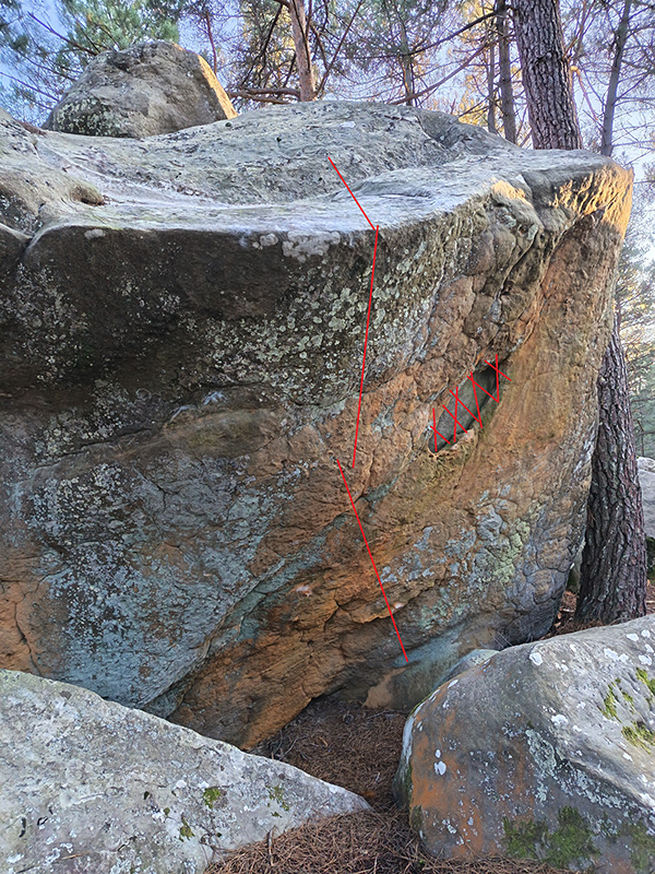 Sur le bloc de La Dalle du Rocher Rouge (n°28 orange). Partir assis sur la face d'Orange Amère et sortir sans la grande "lucarne" ovale (fragile et dangereuse) par convention. NB : cette voie, ouverte en 2014 mais non annoncée, a été redécouverte et nommée par Manuel Marquès en 2026.