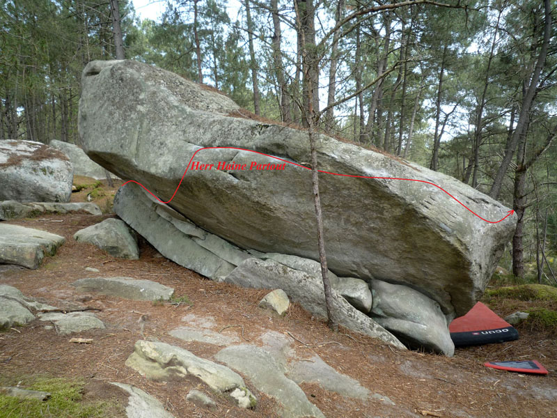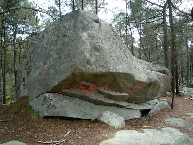 Longue traversée à droite sur le bloc de Pourquoi Tant de Haine? (n°34 orange), le long du sentier des 25 Bosses, entre Querelle de Chapelle et Coup de Torchon. Partir debout dans la facette de gauche et traverser sous le toit avec la fissure horizontale basse comme pour Paul Haine, poursuivre avec la fissure horizontale supérieure, passer l'angle et sortir 3m plus loin en réta sur des plats.
