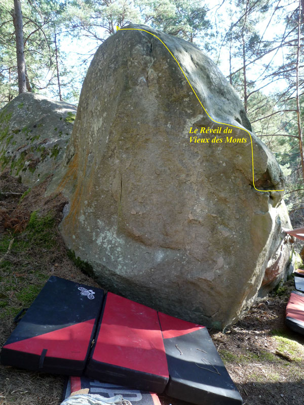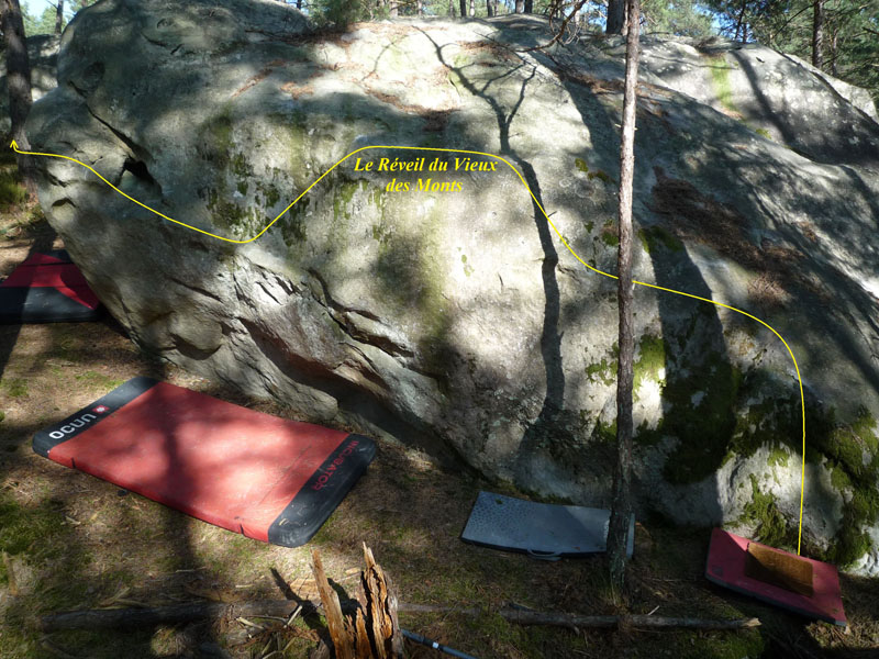 Sur le bloc au dessus et à gauche de Chimpanzodrome (n°24 noir), près du Bloc à Bacchus (n°25 noir). Partir assis complètement à droite, traverser à gauche à l'aide de petits trous, redescendre au niveau d'une rampe, poursuivre par le bas, passer l'angle et sortir tout en haut de la facette de gauche.
