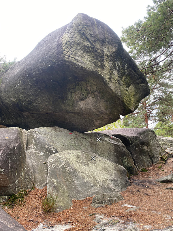 Sur le même bloc et à droite de Trois Hommes et un Coup Fin (n°26 noir). Partir à droite sans le socle comme pour Franchard le Cuisinier et sortir à gauche dans Les Visiteurs (sans le socle).