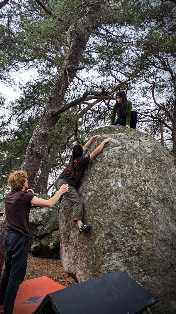 Sur une boule juste en face de Pignon Cuisi, au sommet du pignon. Partir debout en compression avec les deux arêtes et sortir sur des plats au-dessus.