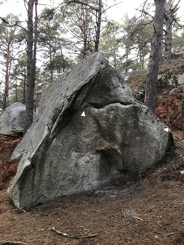Partir assis complètement à droite du bloc, traverser à gauche sur l'arête puis sur des plats dans la fissure horizontale et sortir avec l'arête de gauche comme pour Les Portugaises.