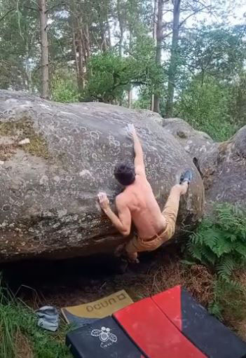 Sur un petit bloc juste à droite de La Brioche (n°16 noir). Partir assis, remonter le bombé et sortir en réta sur des plats.