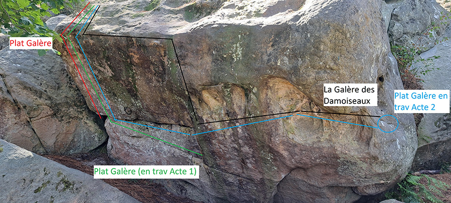 10m en dessous de Chaman, en contrebas du n°16 bleu et du bloc marqué "C". Partir assis comme pour Les Damoiseaux en Goguette, traverser à gauche et sortir dans Plat Galère.