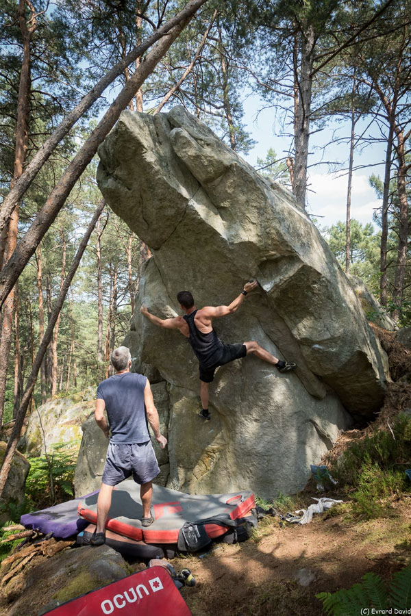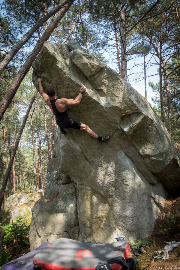 Ligne centrale sur le bloc de Picator. Partir debout, remonter directement le dévers et sortir juste à droite de la proue. Morpho. NB : même difficulté en départ assis.