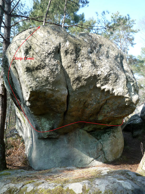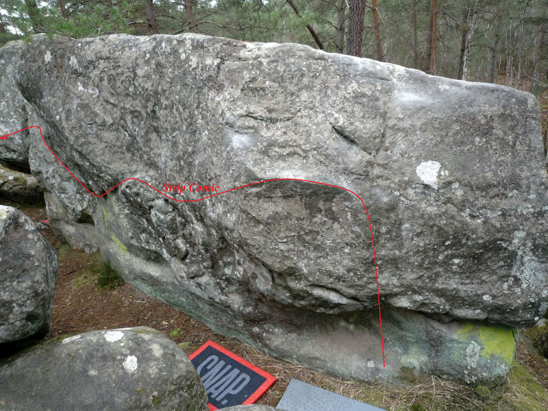 Sur le bloc à gauche de Dracarys. Partir assis et traverser à gauche comme pour Le Strip à Dudule puis continuer à gauche, passer l'angle, traverser sous le toit et sortir dans la face à gauche de Picsou.