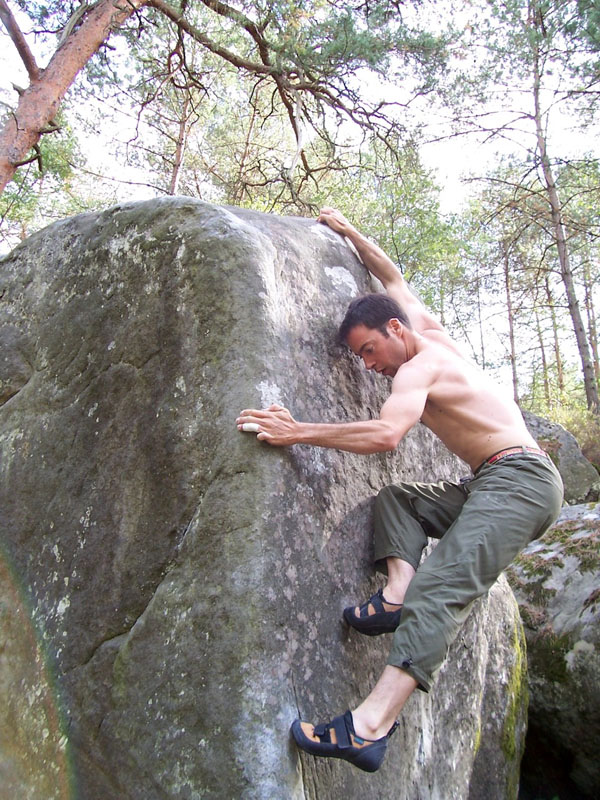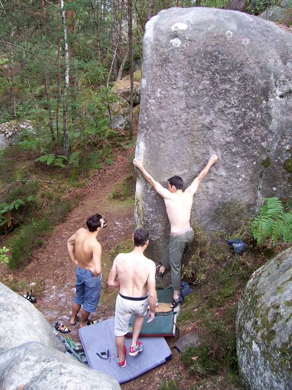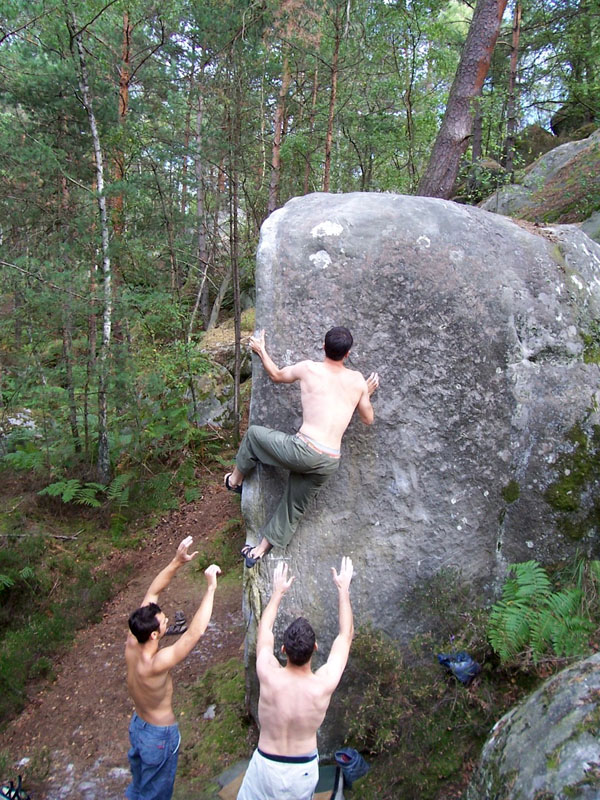 Sur la face de droite du bloc de Lune de Pierre (n°50 rouge). Remonter le mur avec l'arête de Deux Temps Trois Mouvements en MG et des grattons MD et sortir sur des plats.