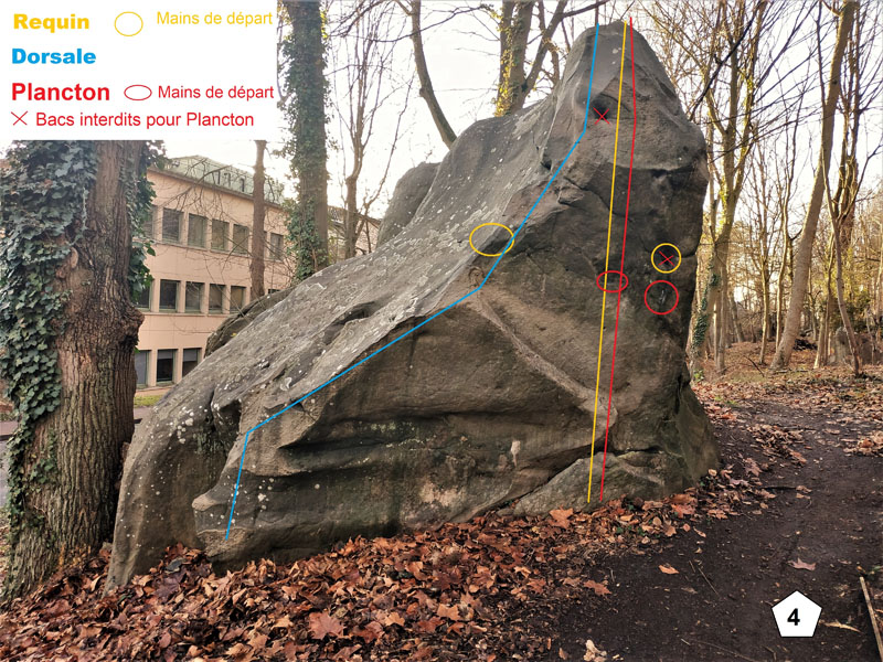 On the boulder "la Grotte aux Fées", in the sector Fac d'Orsay. Standing start as Plancton and exit straight above.