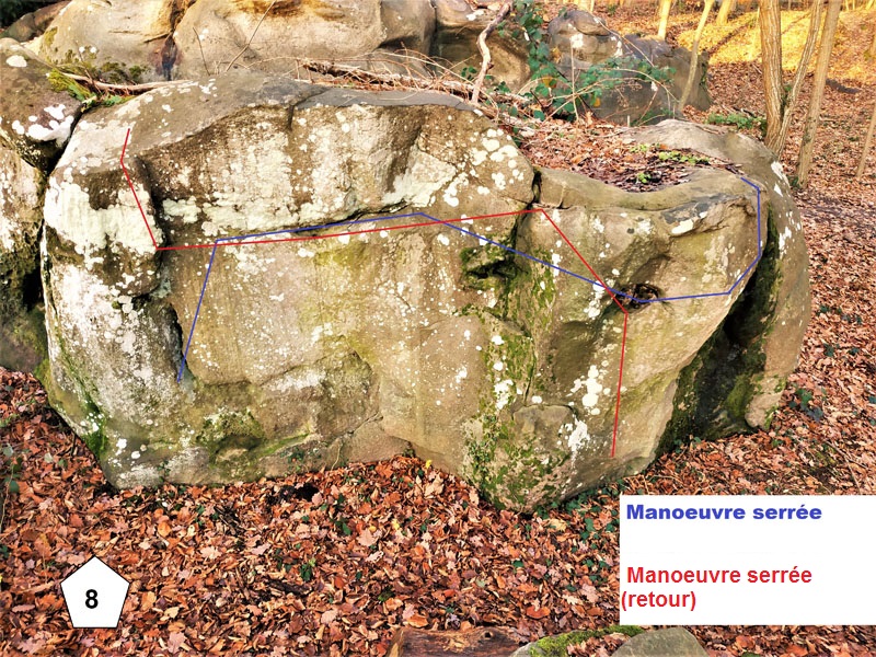Sur le bloc n°8 dans le secteur Fac d'Orsay. Partir assis à gauche, traverser vers la droite et sortir en réta juste après le départ de Manœuvre Serrée (retour).