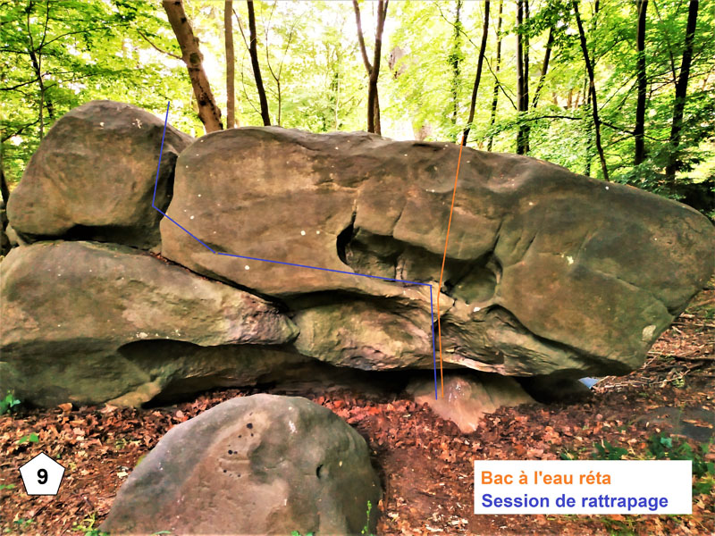 Sur le bloc du "Préau", dans le secteur Fac d'Orsay. Partir assis comme pour Bac à l'Eau Réta, traverser vers la gauche et sortir.