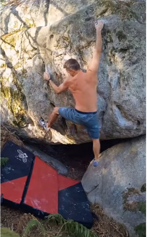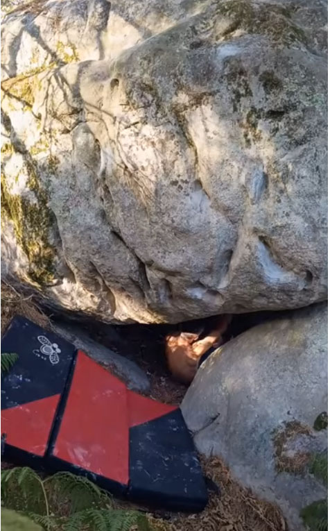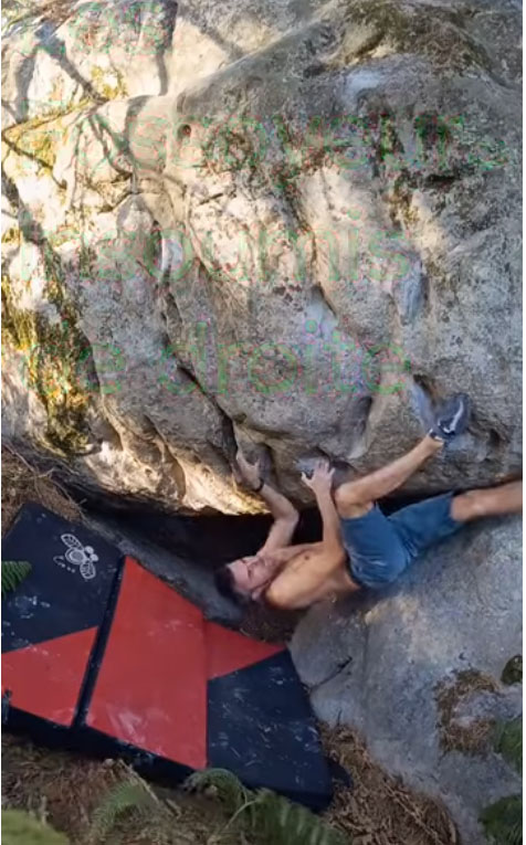 10m derrière La Diagonale des Fous. Partir assis le plus au fond possible avec une rampe de bacs pour les mains et les pieds sur le bloc en face, remonter le surplomb comme pour Les Fossoyeurs Insoumis mais partir à gauche dès la sortie du gros dévers.