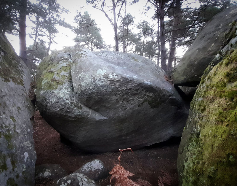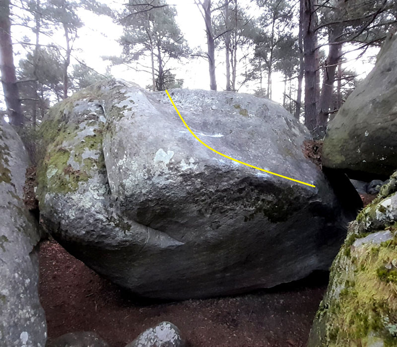 Le long du sentier bleu, sur l'envers du bloc de Morpholoubli. Partir debout sans crash-pad sur la droite du bloc avec les deux mains sur un pommeau, traverser à gauche sur 1m50 et sortir en réta au centre du bloc.