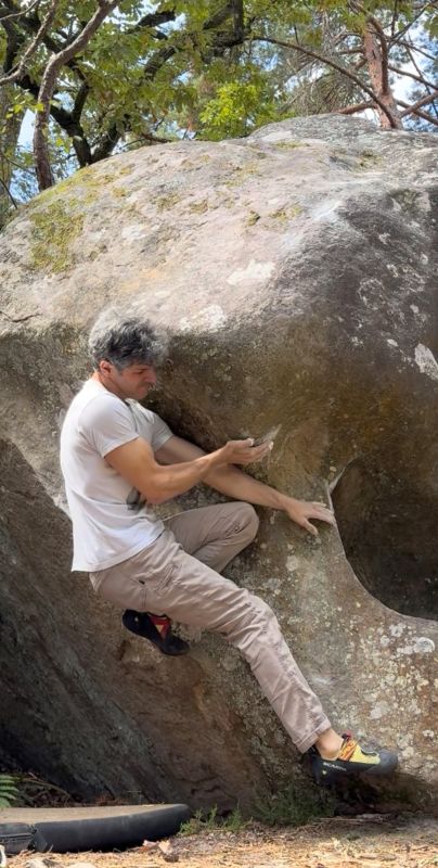 Sur un bloc situé 50m derrière Radis dont on Mange Tout (n°18 blanc), en suivant le sentier vers la gauche. Partir assis avec les deux mains sur les réglettes obliques comme pour Quasimodo (assis), aller chercher l'oblique verticale à droite et remonter la partie droite du mur comme pour Trouillefou.