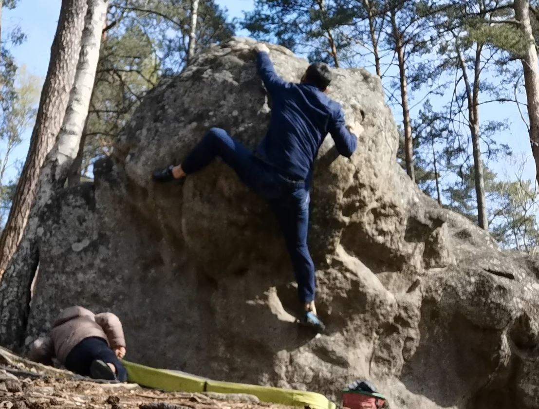 Sur la face Sud d'Accroche des Jardins (n°25 blanc). Partir assis en dessous de la partie arrondie, et remonter le dévers droit au dessus.