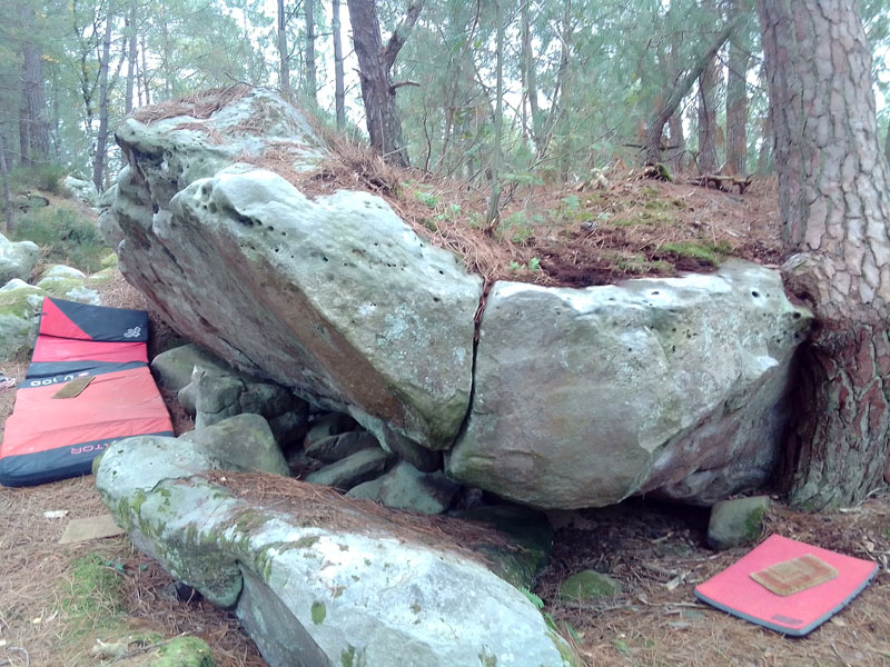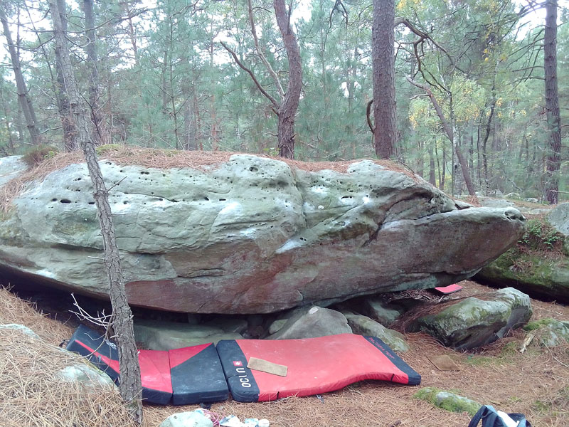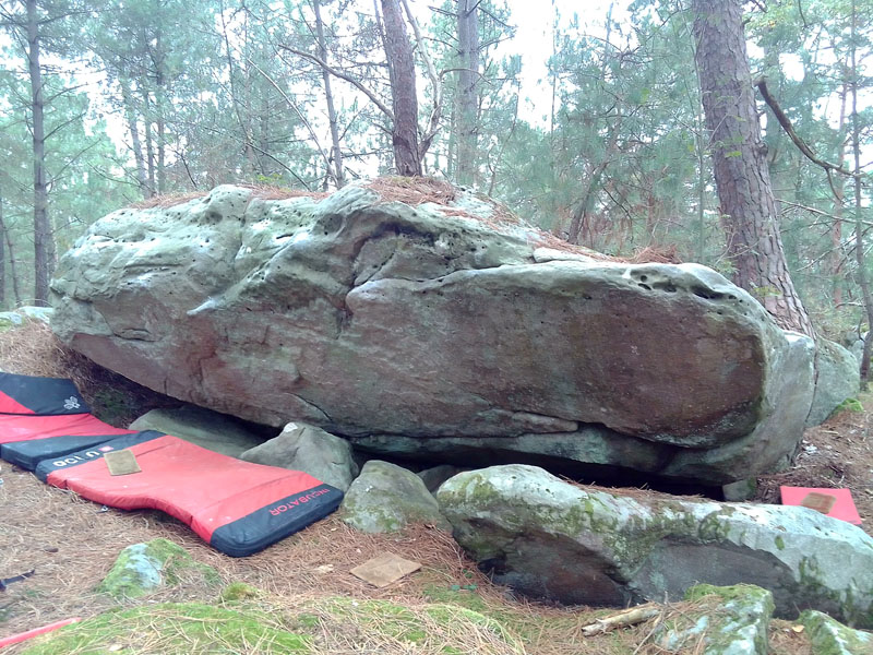 Traversée sur un bloc à trous, à l'extrémité Ouest du versant Sud du Long Rocher, le long d'un petit sentier sur la crête menant au plateau. Partir assis sans crash-pad tout à gauche à côté d'une pierre avec une petite réglette MG et un trou plat MD, traverser à droite, passer l'angle et sortir en réta à droite juste avant l'arbre.
