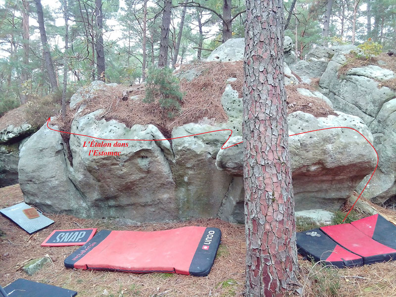 Dans la partie Ouest du massif, en face Sud, juste en dessous du chemin qui mène à Trypophobie. Partir assis tout à droite sans crash-pad avec l'arête en MD, traverser à gauche en passant une grosse écaille détachée et sortir sur l'angle de gauche.