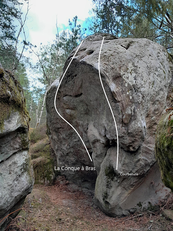 Voie de gauche sur un bloc à l'Est du circuit des 25 bosses, environ 100m au Nord-Ouest de Pissotière et du sommet du pignon. Partir debout à gauche de Coubature.