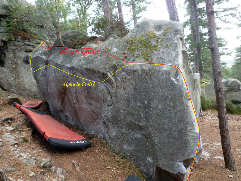Partir assis avec l'arête MG comme pour Sigma le Cavalier, remonter l'arête, traverser à gauche en passant par le bas au niveau d'un gros trou et sortir sur l'angle de gauche.