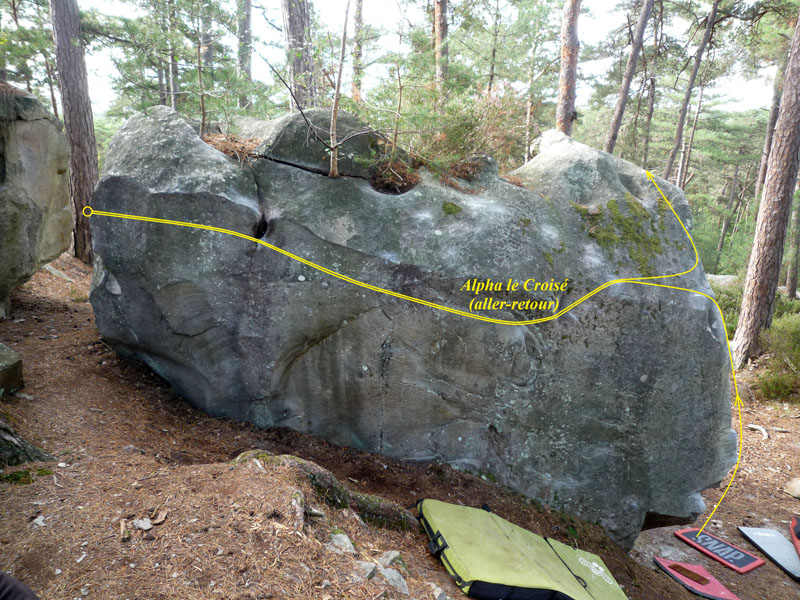 Partir assis avec l'arête MG comme pour Sigma le Cavalier, remonter l'arête, traverser à gauche en passant par le bas au niveau d'un gros trou jusqu'à l'angle de gauche, revenir à droite (toujours par le bas) et sortir sur l'arête de Sigma le Cavalier.