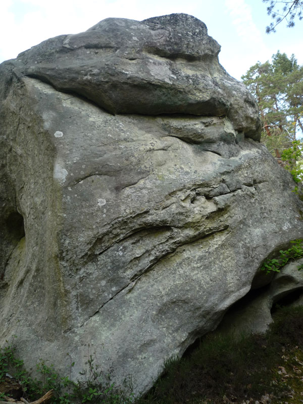 Haut mur/dalle à droite de l'arête du Mentalist, sur le bloc du Bras Carré (n°20 blanc). Partir comme dans Le Bras Carré (n°20 blanc) mais au lieu de traverser à droite, poursuivre tout droit avec l'arête en MG et de bonnes inversées.