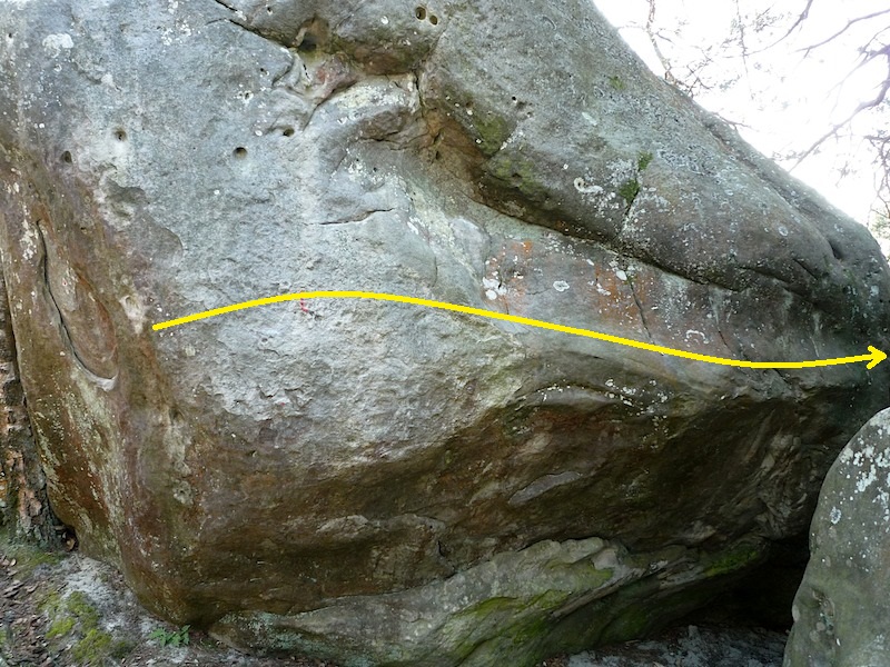 Partir tout à gauche de la face avec l'arête de L'Angle de l'Anord en MG (flèche rouge et blanche) et les prises des Trous de l'Anord (n°50 rouge) en MD, traverser à droite (sens retour de Wandering Star) et sortir dans Starlette.