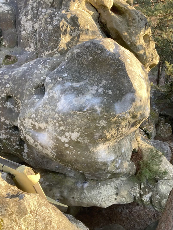 Sur le gros bloc de l'Hippopotame, au dessus et à droite de Cripple Crow. Partir assis sans crash-pad comme pour Le Jour le Plus Long (juste à droite du petit bloc), remonter la proue vers la gauche et sortir sur les aplats de la rampe à gauche de l'arête, sans la grosse prise de gauche.