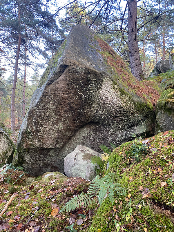 In the slope, underneath the blue path, between Peau d'Âne and Le Mérou. Sitstart on the right with slopers, climb the overhanging arete and exit at the top.