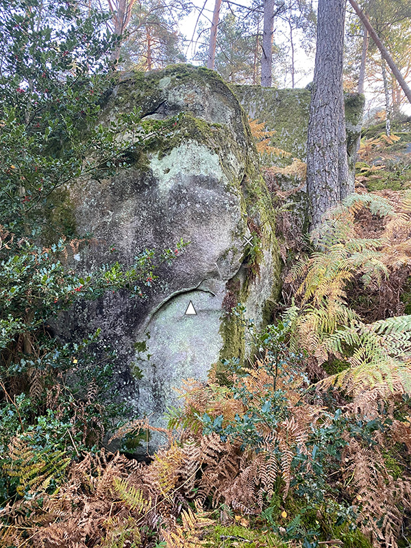 In the slope, underneath the blue path, between Peau d'Âne and Le Mérou. Standing start just left of the right arete with a good undercling, dyno with two hands towards a good hold and exit above.